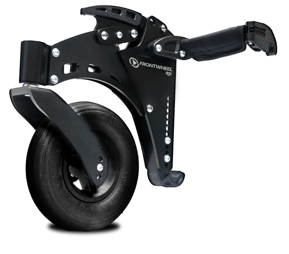 A roda dianteira todo-o-terreno Frontweel acopla-se à armação por baixo do apoio de pés para aumentar a rigidez. Pode ser instalado com o utilizador sentado na cadeira e bloqueado  numa posição elevada quando não está a ser utilizado.