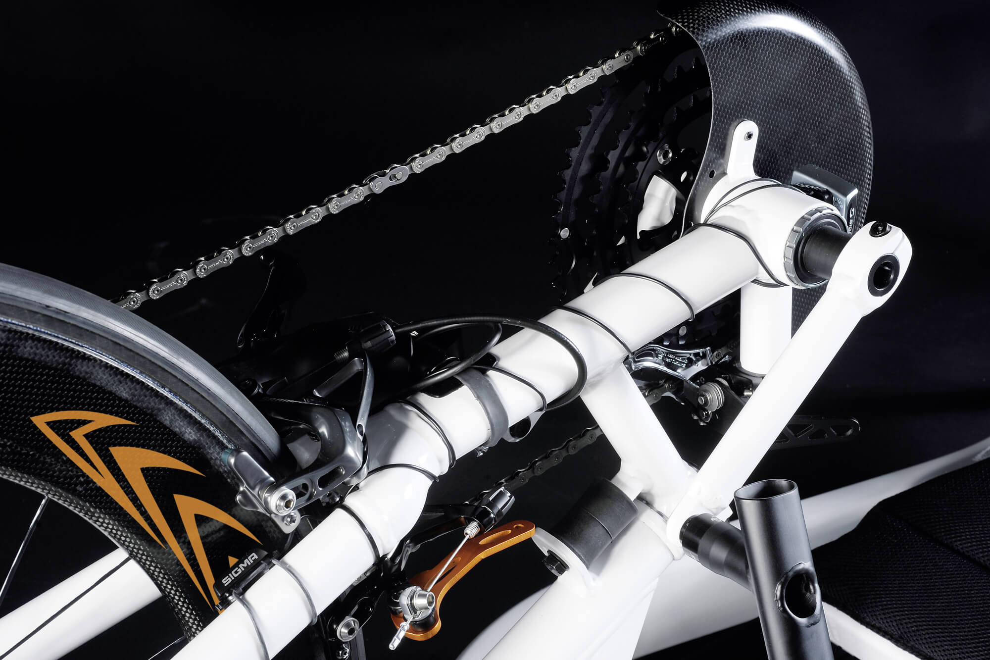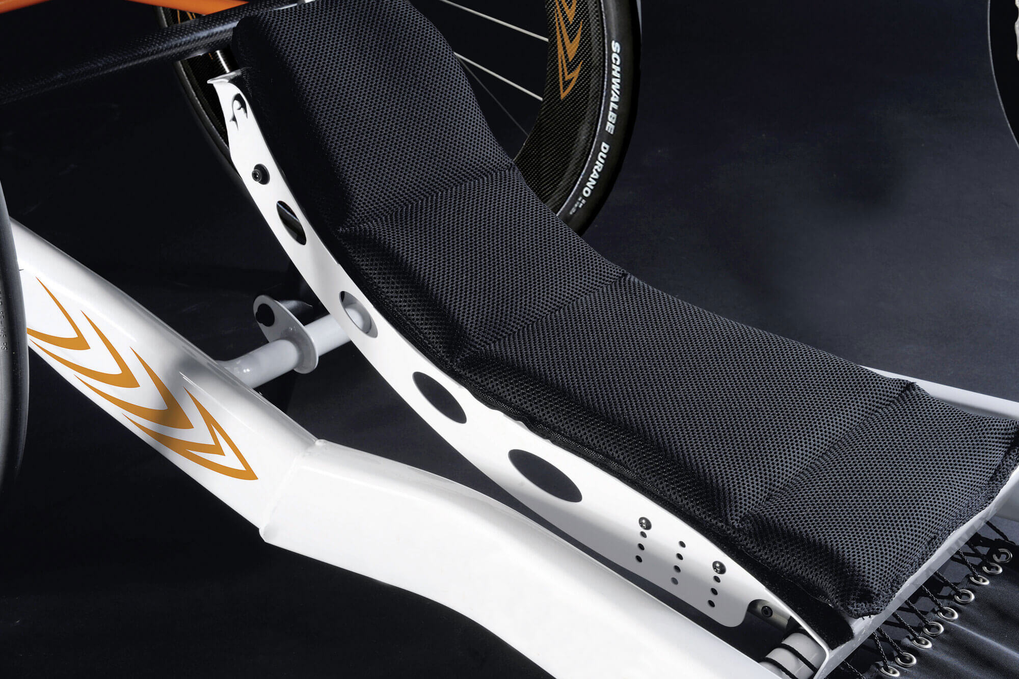 Se tirar um pouco de peso aqui, um pouco ali. Naquela peça ali, porque não reduzimos algumas gramas? Porque quando se trata de velocidade ao mais alto nível de competição, o peso é o mais importante. A handbike RGK Shark RS é extraordinariamente leve graças à otimização do peso de todos os seus componentes e ao seu design high-tech.