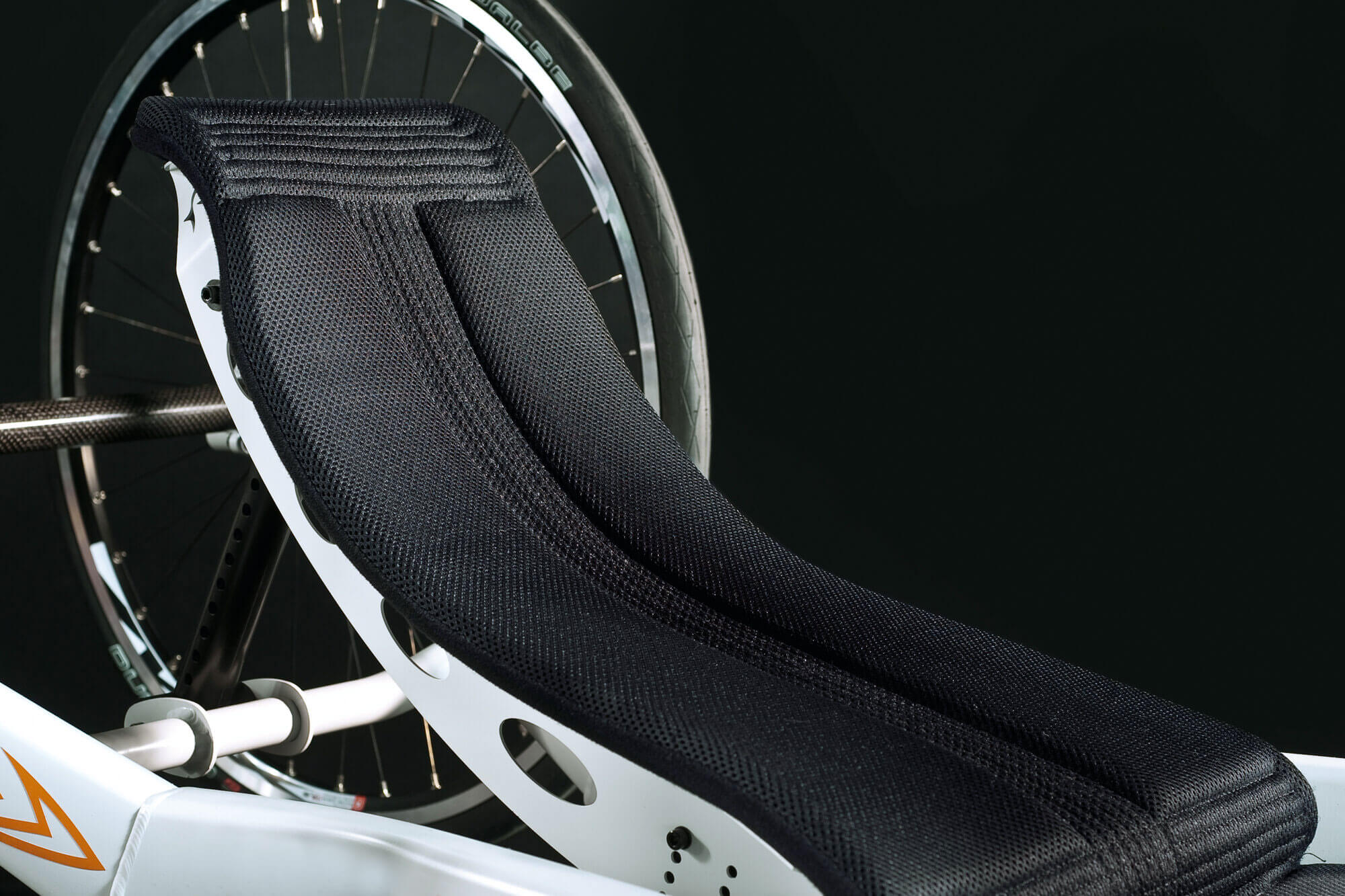 A união entre a estrutura e a forqueta é realmente robusta. Assim, consegue-se uma considerável redução da flexibilidade, melhorando a eficácia na propulsão e o rendimento geral da handbike.