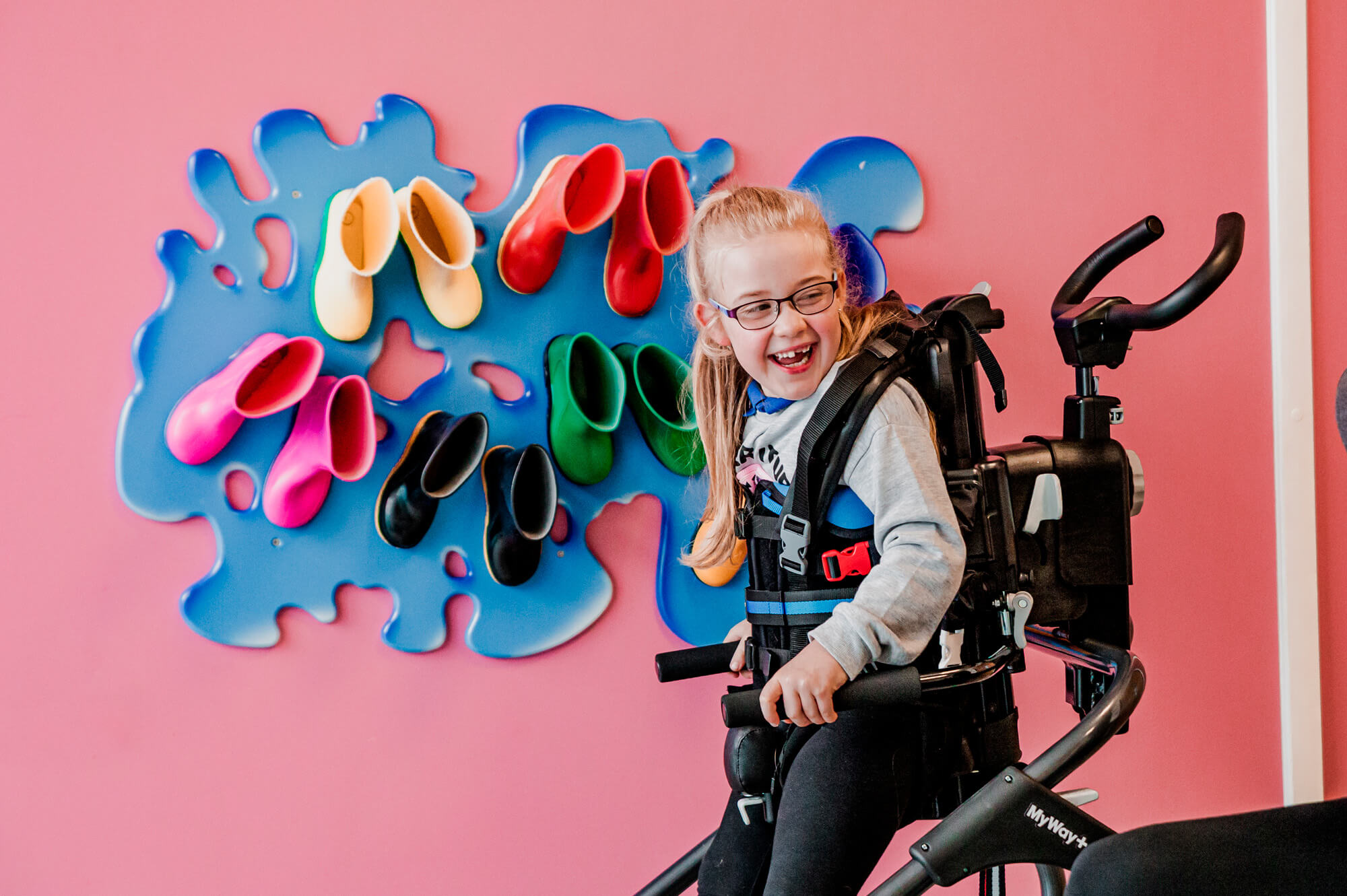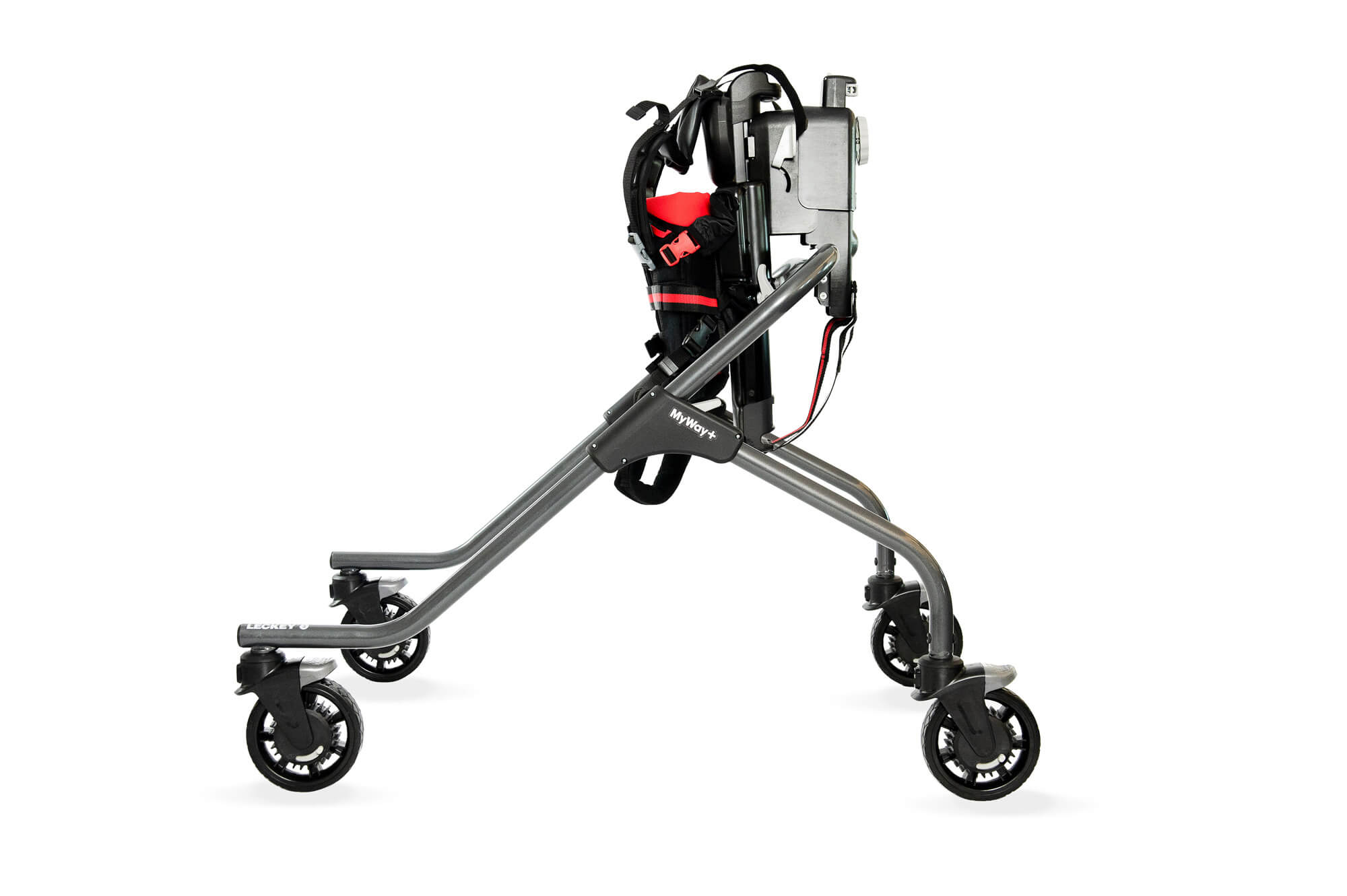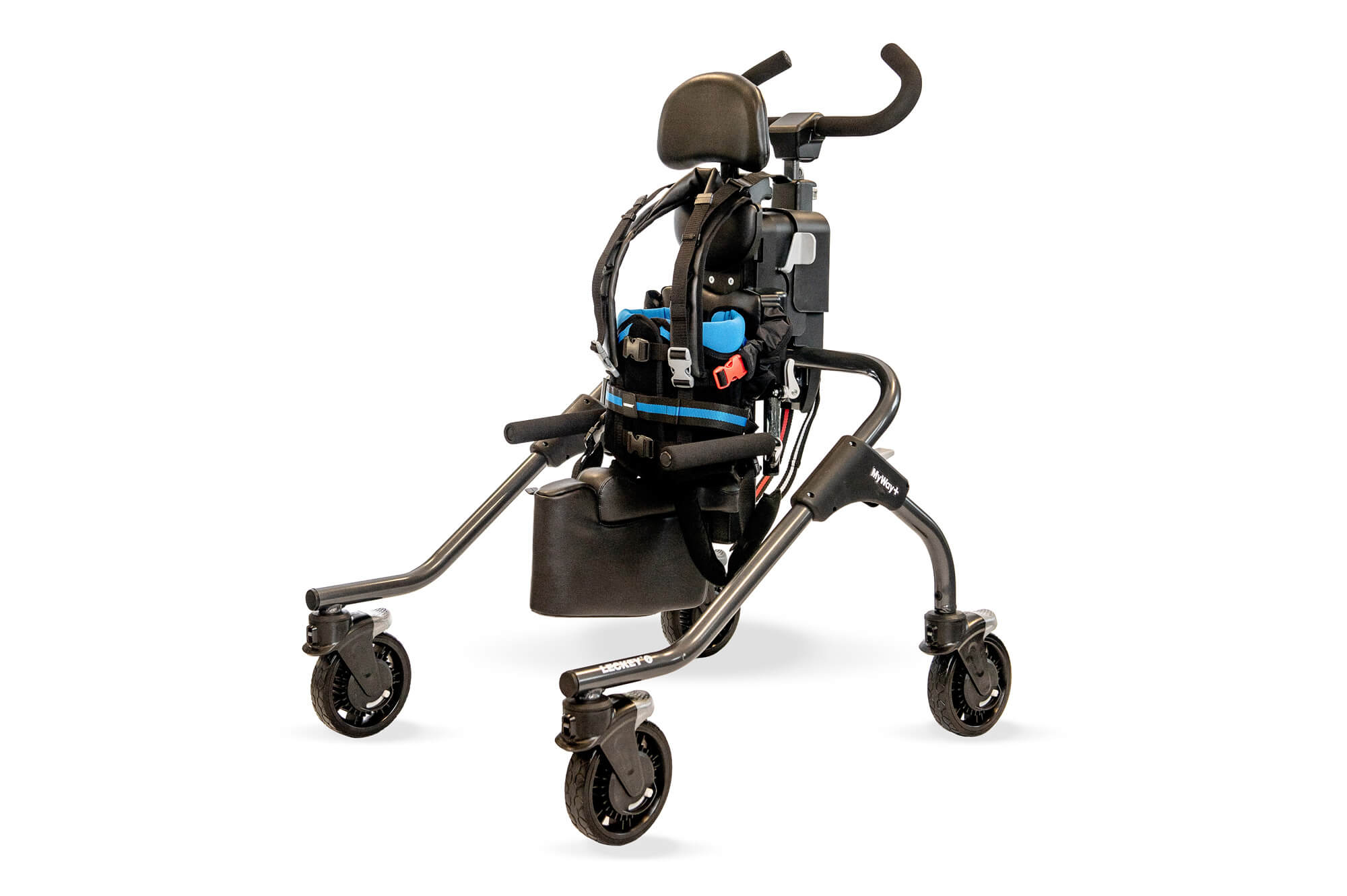 As crianças com necessidades especiais geralmente têm músculos mais frágeis, especialmente na área do quadril, e isso pode afetar a sua marcha, função e também o desenvolvimento da articulação da região pélvica e coxas. A função de bloqueio lateral do Myway+ posiciona as rodas da armação em posição lateral, direcionando o deslocamento lateral da criança e fortalecendo assim os músculos abdutores do quadril, fundamentais para otimizar o desenvolvimento fisiológico das articulações dos quadris dos mais pequenos.