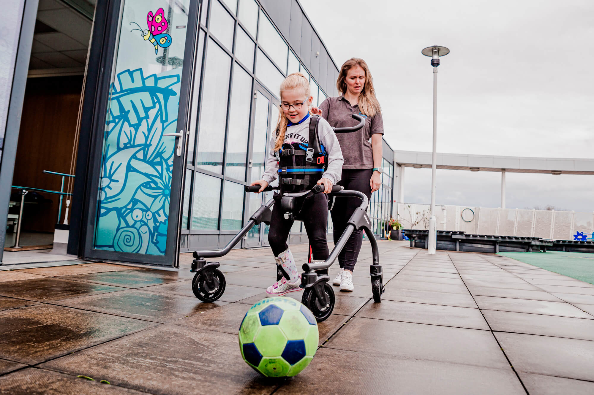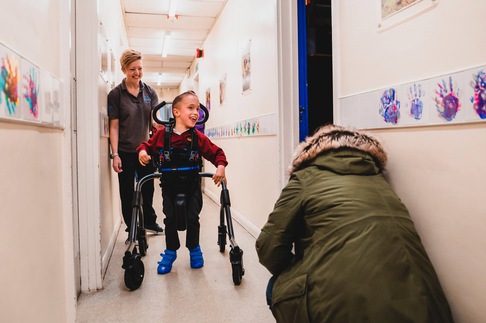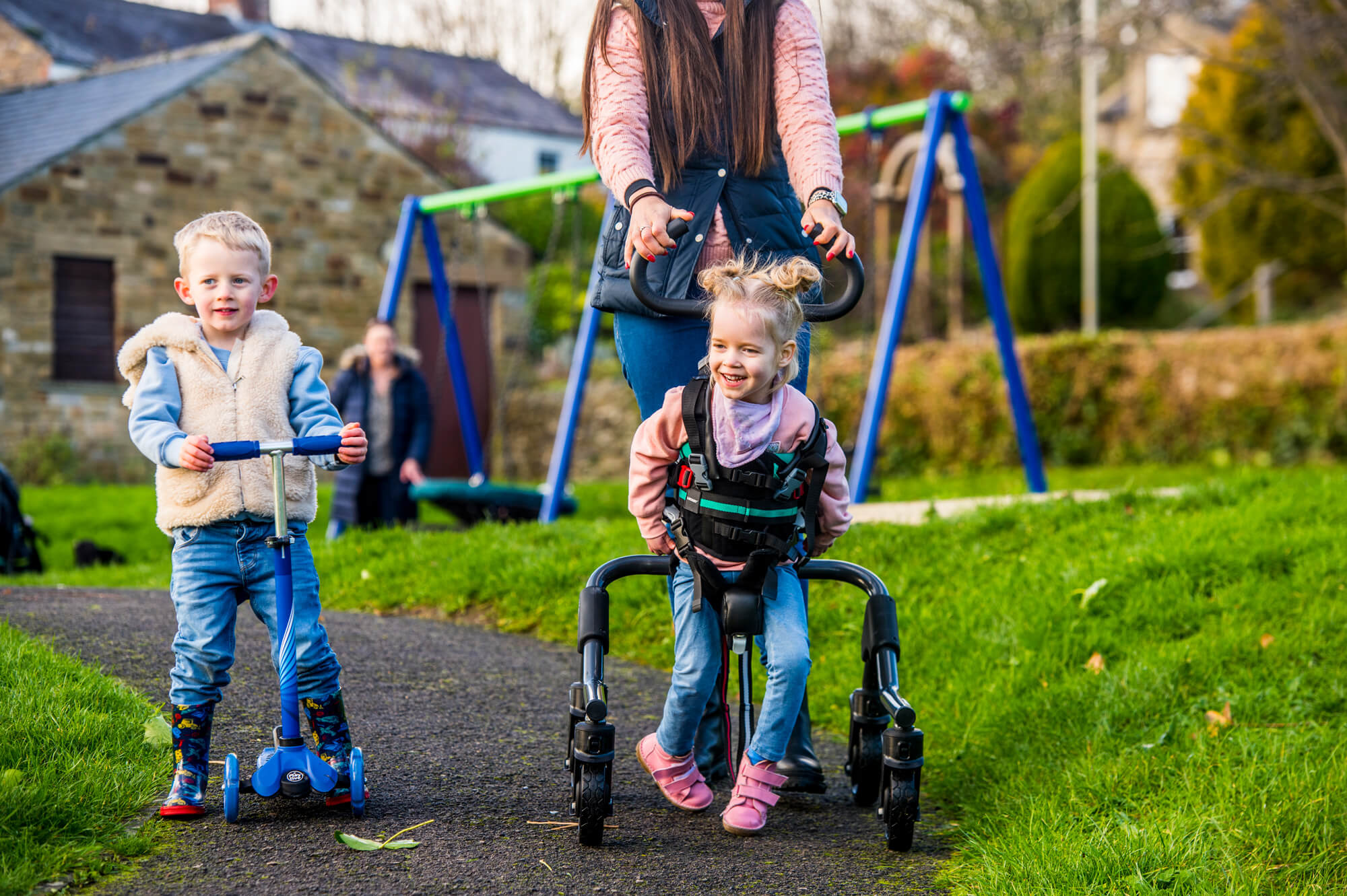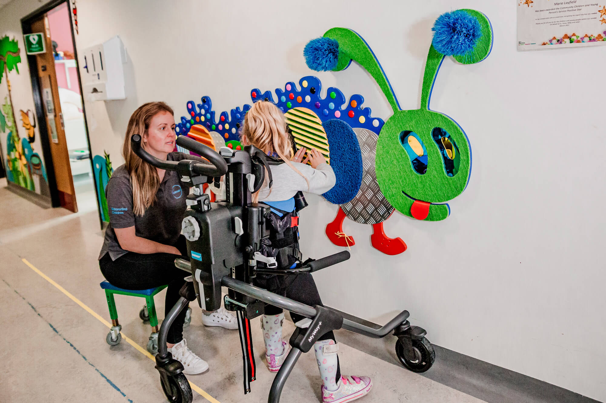 As crianças com necessidades especiais geralmente têm músculos mais frágeis, especialmente na área do quadril, e isso pode afetar a sua marcha, função e também o desenvolvimento da articulação da região pélvica e coxas. A função de bloqueio lateral do Myway+ posiciona as rodas da armação em posição lateral, direcionando o deslocamento lateral da criança e fortalecendo assim os músculos abdutores do quadril, fundamentais para otimizar o desenvolvimento fisiológico das articulações dos quadris dos mais pequenos.